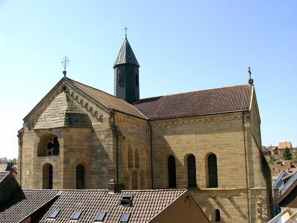 The Abbey Church of Otterberg was founded in 1143 by Cistercians as the abbey church of a daughter abbey of the Eberbach monastery. In the 15th century, the monastery slowly declined. In 1504, and in 1525 during the Peasants' War, the monastery was burned and plundered. At the end of the 16th century, the abbey church began to be used simultaneously by the Catholic and Protestant parishes, but not without causing disputes. In 1708, therefore, a separation wall was built between the two spaces. The choir hall with the transept is now used as the Catholic part, the remaining nave as the Protestant part. In 1979, the wall was removed as part of a major renovation, but the structure of the property was not changed.