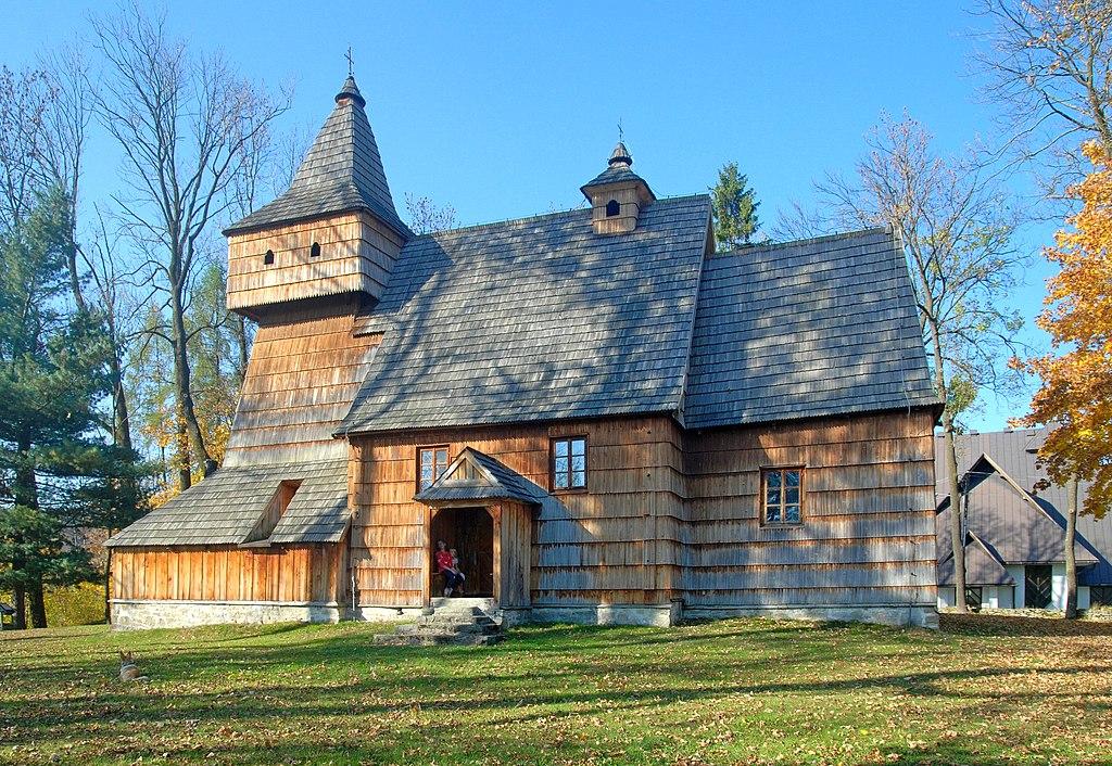 Its architectural features are typical of the wooden churches of the Małopolska region, such as the broad-based tower that narrows towards the bell-house and the polychrome work that decorates the nave and chancel.