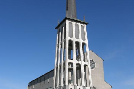 Bodø Cathedral was designed by architects Blakstad and Munthe-Kaas after an architectural competition in 1947. The church is built of reinforced concrete and has a monumental basilica-like main form with self-supporting bell towers. It was consecrated in 1956. The architects describe the building as a "basilica without columns".