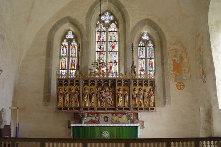 Due to its staged construction, the church in Burs has an unusual shape. The small nave and tower date from the early and mid-13th century respectively. The Gothic choir, disproportionately large compared to the nave, was built in the 14th century, replacing the original Romanesque one.