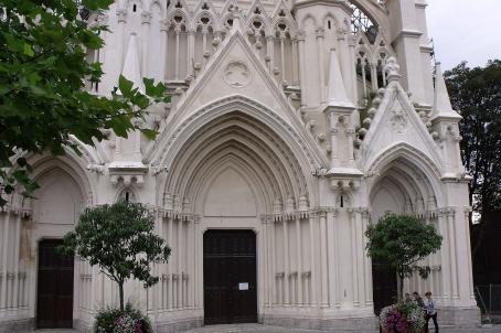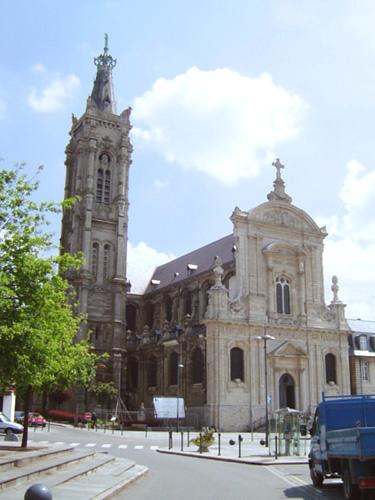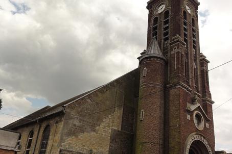 Edifice with an elongated plan and the appearance of a fortress. The main façade is a high, massive gable wall on three elevations. The first contains the portal with a tympanum, topped by a rose.