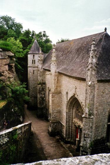 Introduced by a flight of steps, a monumental staircase leads to the Saint-Michel oratory and then to the chapel. Inside, a stone vault on crossed ribs, an exception for the time, in the 15th century, when almost all the vaults were made of wood. The coats of arms of the Boutteville and Toulbodou, founding lords, are present on many shields of the vault, as well as on some stained glass windows. A path leads to the fountain of devotion. This fountain, dating from 1708, is set up in a square enclosure with an interior bench. A niche houses a statue of Saint Barbara. Legend has it that young unmarried girls would throw a round-headed pin into the niche and try to reach the hole in the fountain basin to find out if they would get married within the year. Continuing along the path, one reaches the banks of the Ellé River.