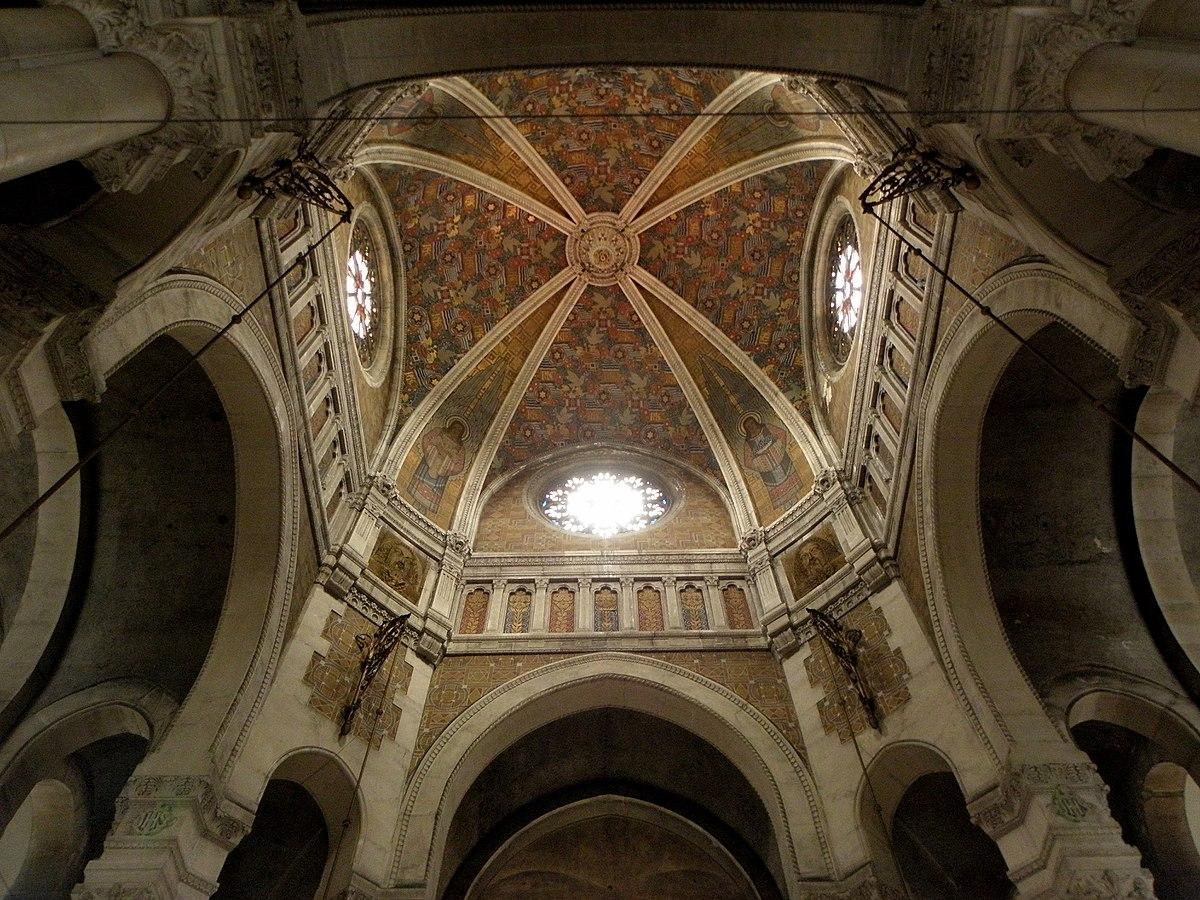 The church is characterized among other things by its dome, which was fashionable at the time for orientalist architects, but less so for its architect Bossan. The plan of the church, a Latin cross centred on an octagonal dome with side chapels and an ambulatory, was also used for the Basilica of Ars. Another peculiarity, structural this one, is to have made the mass of the vaults carried by groups of very thin columns, seemingly out of proportion, thanks to the use of the vault in landfill. This technical innovation was later taken up again in the Basilica of Notre-Dame de Fourvière.