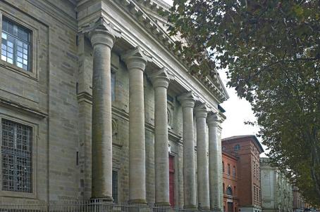 The construction of the present church would date from the end of the 15th century, around 1480. Its bell tower signed Nicolas Bachelier (author of the Hôtel d'Assézat and the Pont Neuf) was built in 1551. Symbol of ecclesiastical power, its spire, which was 87 m high, was dismantled in 1795. It was rebuilt in 1881, raised to 91 m, and marked the highest point of the city until 1926. This bell tower was comparable to that of the Cathedral of Sainte-Cécile d'Albi. It collapsed brutally in 1926, causing extensive damage to the surrounding houses. About thirty busts in bossage sculpted by Nicolas and his students are exhibited at the Musée des Augustins in Toulouse. The church, which looks like a medieval fortress with thick walls, narrow openings and a north tower with crenellations, has an Italian Renaissance-style tympanum on the façade, made of ceramics representing a copy of Fra Angelico's Coronation of the Virgin. This flamboyant decoration was made by Gaston Virebent in 18742. The Renaissance portal dates from 1537.