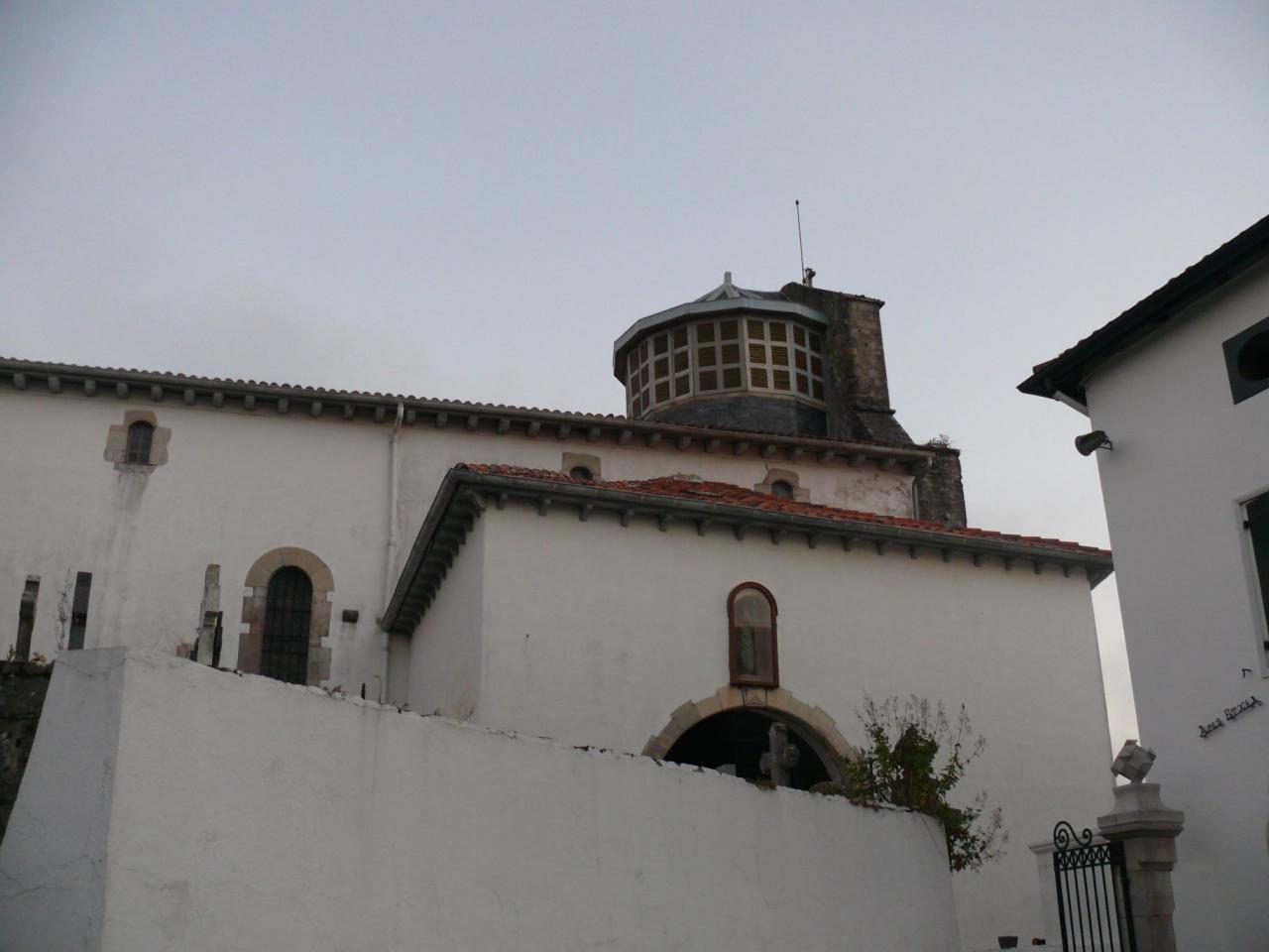With its covered porch and bell tower-pediment of grey stones, visible from far away at sea, the building presents to the visitor a sober and massive visage, which contrasts with its inner richness. Following the Basque tradition, the choir with the semicircular chevet and the altar, largely raised, are dominated by three levels of galleries that surround a single nave without transept or side chapel.
