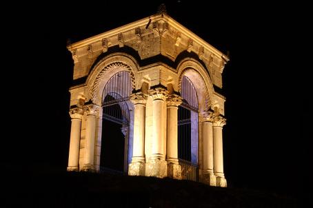 Single-ship elongated plan church. A bell tower surmounts the entrance facade; Sober and simple Romanesque architecture. The church stands above ancient medieval fortifications.