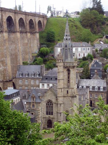 The church of Saint-Mélaine, in flamboyant gothic style (xve century) dedicated to Melaine de Rennes. The priory of Saint-Mélaine was founded between 1149 and 1157 following a donation from Guyomarc'h III, Lord of Morlaix. The church was built at the end of the 15th century by the Beaumanoir workshop of architects. In 1879, the roof lantern of the church was replaced by a wooden spire covered with zinc. The church houses beautiful sandpits and statues from the 15th to the 19th century, as well as a Dallam organ restored in 1971.