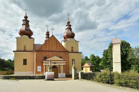 Built in the 16th century, the church, which was severely damaged during the First World War, was rebuilt throughout the 20th century. In the 18th century a spire and extensive covered veranda (exonarthex) were added. The church surface, with the exception of the bell-house, is covered by shingles, which enhances the picturesque appeal of the building’s mass. The current fittings include a late-renaissance main altar from the early 17th century and reconstructed in 1948-49 after its destruction in 1915.
