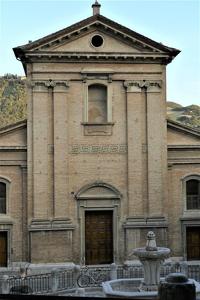 Fossombrone Co-cathedral was originally a Benedictine abbey, almost entirely rebuilt in neoclassical style by Cosimo Morelli d'Imola in 1776-84, with the exception of the 15th-century bell tower. It is characterised by a façade divided into three parts by high pilasters that extend the central part.