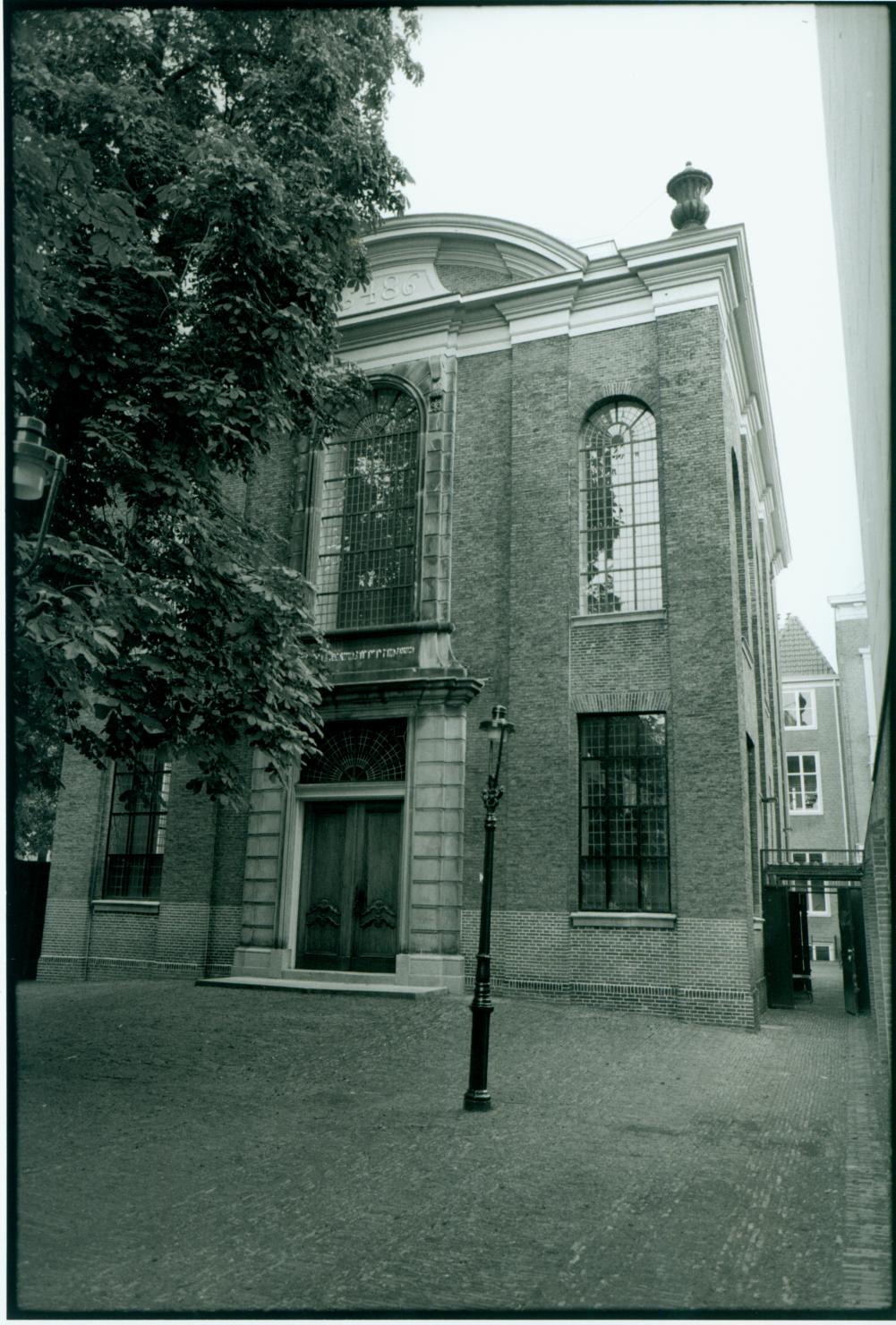 The Portuguese synagogue was consecrated in 1726 based on a design by Daniel Marot in the late style of Louis XIV. The layout of the building is rectangular in shape and its façade is divided by the colossal order of pilasters, spanning the entire height of the building. The monumental entrance includes a classical fronton which contains the Hebrew verse referring to Psalm 84:2 and the date 5486 (1726 CE). The interior is divided into three aisles with the use of Ionic columns which support the women's gallery. In line with the Sephardic layout of synagogues, the bimah (teva) is not positioned at the center of the building but closer to the entrance and the benches face the main aisle instead of the Torah ark. The layout of this Sephardic synagogue is similar to the layout of the Portuguese synagogue in Amsterdam. After the Second World War, the building became abandoned for a long period of time. It was bought by the Liberaal Joodse Gemeente in 1972 and subsequently renovated in 1974/76 and 1992/93.