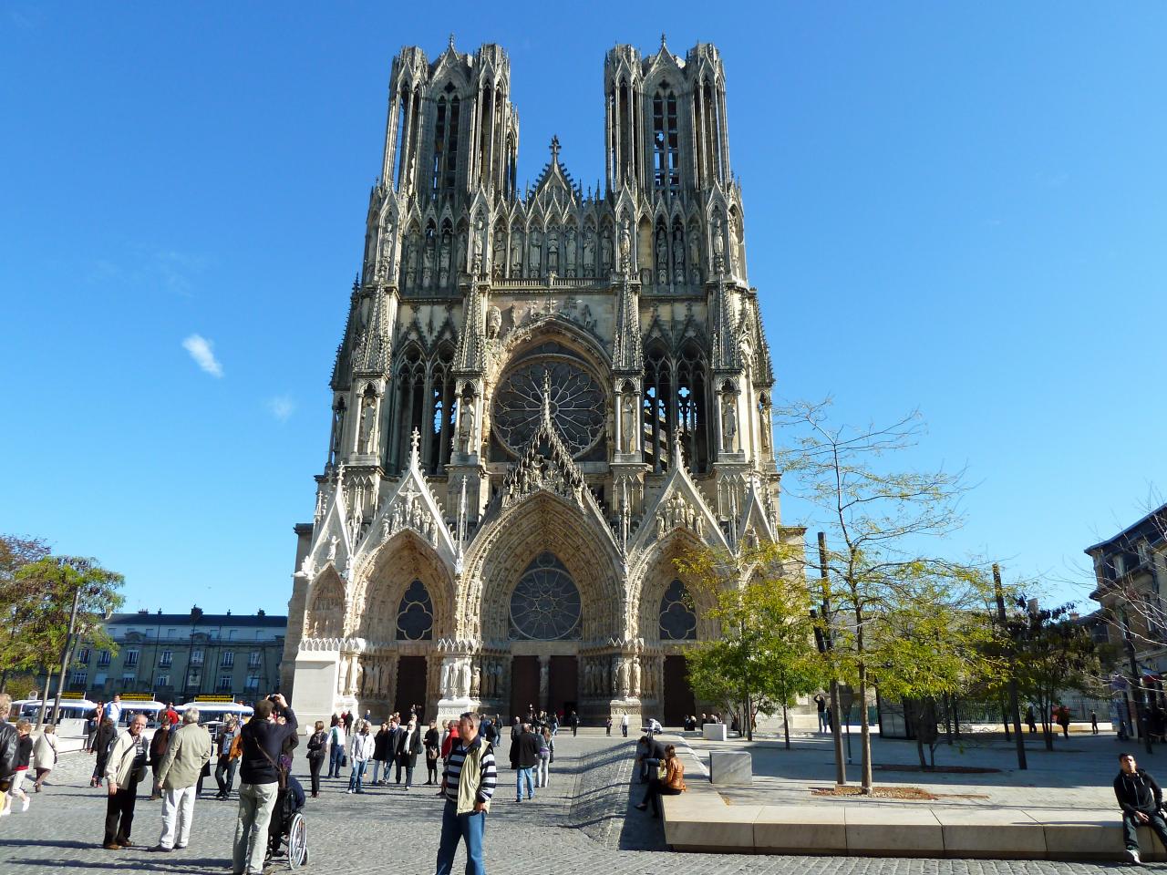 Sa construction a commencé au début du XIIIe siècle. Elle est postérieure aux cathédrales Notre-Dame de Paris et Notre-Dame de Chartres, mais antérieure aux cathédrales Notre-Dame de Strasbourg, Notre-Dame d'Amiens et Saint-Pierre de Beauvais. Consacrée à la Vierge Marie, la cathédrale de Reims a été achevée au XIVe siècle. Elle a surtout connu une destruction très importante pendant la Première Guerre mondiale.