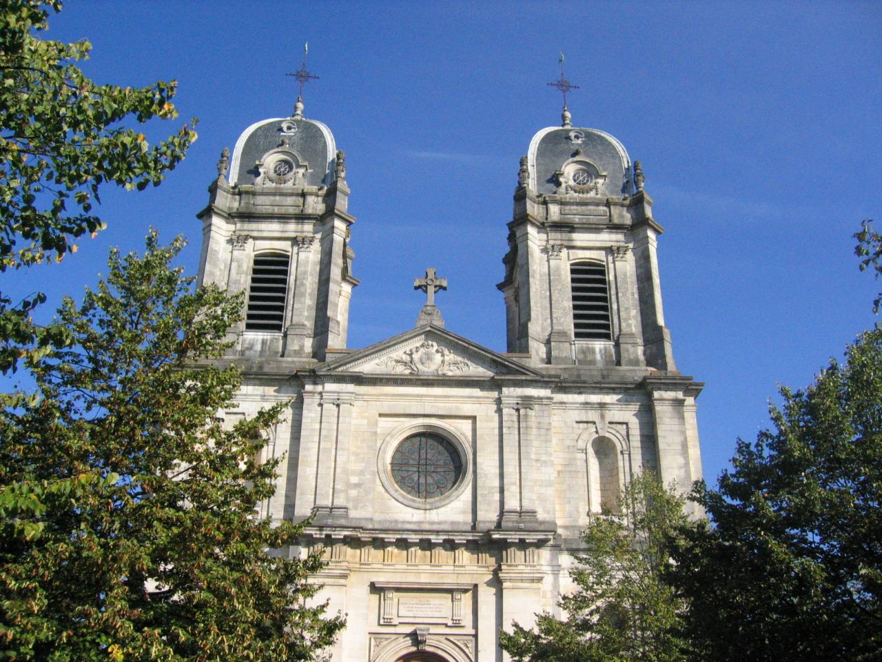 Cette église est bâtie selon un plan en croix latine. La façade d'entrée occidentale est tripartite et à deux niveaux d'élévation. L'avant-corps central de cette façade est percée d'un portail à voussures surmonté d'un entablement et encadrée de deux pilastres. Le second niveau est ajouré d'une rose surmontée d'un fronton triangulaire. Les deux façades symétriques des collatéraux sont également percées de portes surmontées de roses et de niches pouvant recevoir une statue. Ces deux façades sont surmontées d'un campanile de base carrée élevé d'une toiture à quatre pans. C'est une façade harmonique à l'aspect austère. Cette façade occidentale, longtemps inachevée, a été construite sur les plans de l'architecte Parisien Paul Gallois en 1894. Le flanc sud présente également ce même aspect austère. En revanche, le mur gouttereau nord donnant sur une agréable placette du centre historique ne manque pas de charme malgré une certaine raideur.