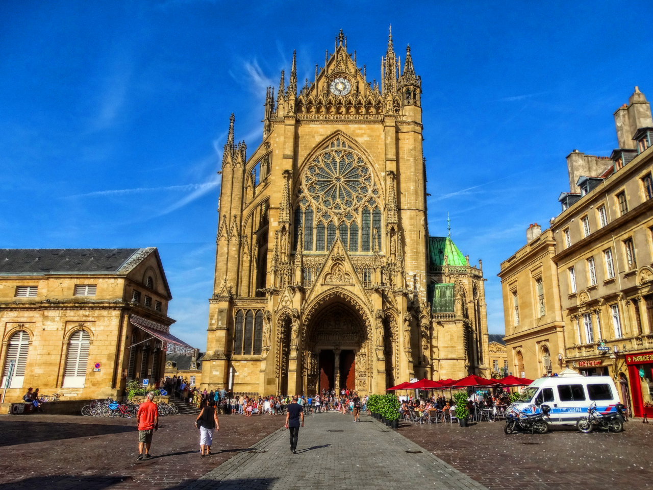 La cathédrale est bâtie en pierre de Jaumont. La nef est du XIIIe au XIVe siècle, ère du gothique rayonnant reconnaissable par ses vastes verrières, comme la verrière occidentale de la cathédrale, tandis que le transept et le chœur n'ont été élevés qu'un siècle plus tard, dans une période de prédilection du style flamboyant, qui a été propice à l'édification des "murs vitrés" du transept (inspirés par ceux de la cathédrale de Toul). La cathédrale de Metz a la particularité de ne pas posséder de "façade harmonique" à la manière des autres grandes cathédrales gothiques de France (comme à Reims, Strasbourg ou encore Toul), c'est d'ailleurs grâce à cette façade singulière qu'a été possible la réalisation de la grande verrière. Ainsi la cathédrale n'a qu'un seul portail sur sa façade principale.
