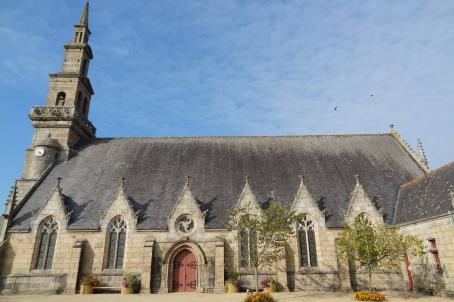 Construite au milieu d’un enclos paroissial, elle présente une nef prolongée par un chœur à chevet plat, deux collatéraux et un clocher de type trégorrois.