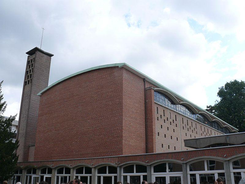 L'église de forme parallélépipédique rectangle est rehaussée par son clocher-campanile. À l'intérieur, deux séries de dix colonnes supportent un voile de béton à double courbure, et un choeur monumental vient terminer l'édifice, pur une parfaite visibilité des rites et cultes.
