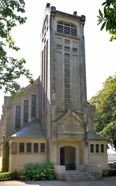 Edifice en béton armé, avec plan en croix latine et transept saillant. Le chevet est polygonal.