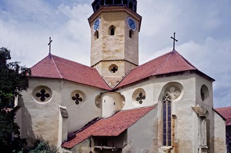 The three-aisles Romanesque basilica, already strengthened by a defence wall, was equipped with a bell tower on the western side in 1290. At the beginning of the 15th century, both the tower and the nave were adapted to the Gothic style and a second ring wall was erected. The first defence wall was heightened up to 12 m and strengthened by seven defensive towers and an outer bailey. A third wall, which did not survive to this today, surrounded the moat that was filled up in 1814. A parapet walk was built on the inside of the first defence wall, which is partially preserved today.