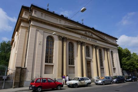 The synagogue, designed by the Christian architect Lajos Frey, is a magnificent Neo-Classicist building erected in 1842-45. Its western (entrance) and northern (street) façades are decorated by Corinthian porticos. The interior is spanned with sail vaults and was richly painted, probably in the late nineteenth or early twentieth century. In 1980 the building was converted into a library, but its interior was almost completely preserved.