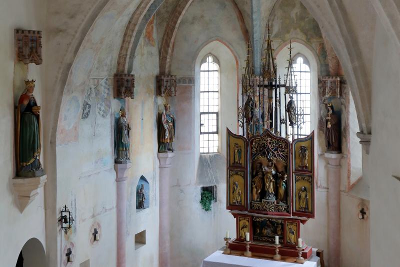 St. Elisabeth's Chapel in Burghausen Castle was founded by Duke Henry XIII (1235-1290) and his wife Elisabeth (1236-1271). It was consecrated to St. Elisabeth of Thuringia, the duchess' aunt who was canonised in 1235. The present appearance of the nave, which was originally flat-roofed and most probably painted, is mainly determined by the late Gothic-style net vault from the time of George the Wealthy (1455-1503). The walls of the choir are decorated with wall paintings dating from around 1400, and the remains of a late 16th-century painting can also be seen.
