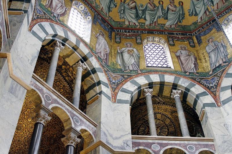 The Palatine Chapel of Aachen was built between 792 and 804 by Odon of Metz (742-814). It was Charlemagne's private chapel in Aachen, which was part of his palatine complex. It contains the remains of Charlemagne and was a place of coronation for about 600 years. In the 21st century, the chapel has been preserved almost intact, despite later additions and major repairs in the 19th century. As part of Aachen Cathedral, it is included in the UNESCO World Heritage List.