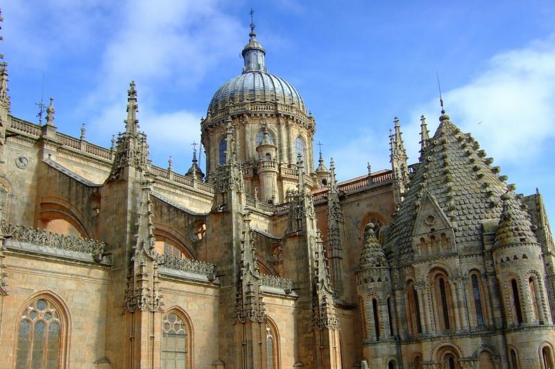 The Cathedral of Santa María, known as the "Old Cathedral", is one of the two cathedrals of Salamanca. its construction began in the 12th century and was completed in the late 14th century, in Romanesque and Gothic styles. Its structure is adjacent to the "new cathedral". The Cathedral of the Assumption of the Virgin, popularly called “New Cathedral”, was built between the 16th and 18th centuries, mixing late Gothic, Renaissance and Baroque styles. It is the second-largest cathedral in Spain by dimensions.