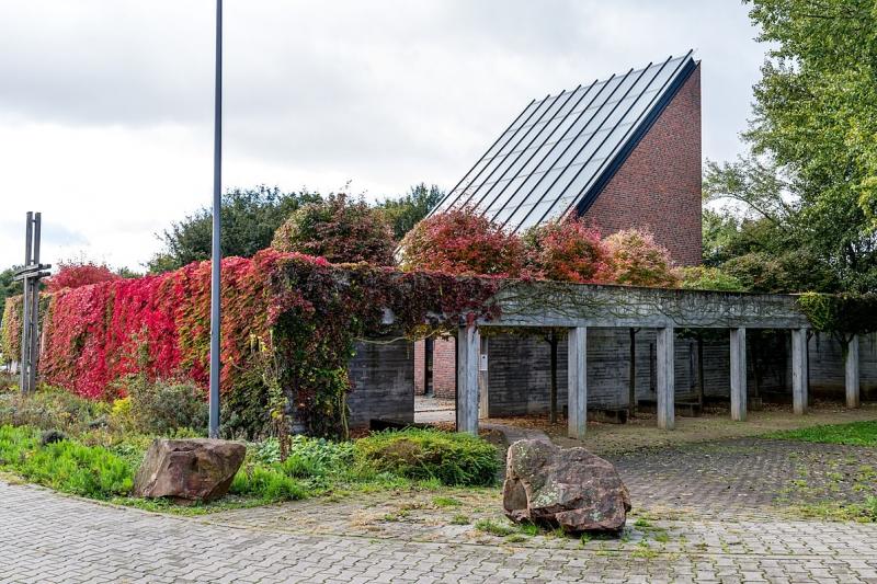 The Siegerland motorway church, located on the B45, was inaugurated on 26 May 2013. The building, a multi-award-winning design by Frankfurt architects Schneider + Schumacher, is an example of post-modern religious architecture. The design of the church exterior is based on geometric triangular shapes. In the entrance area of the church, there is a typographic installation by Peter Zizka.
