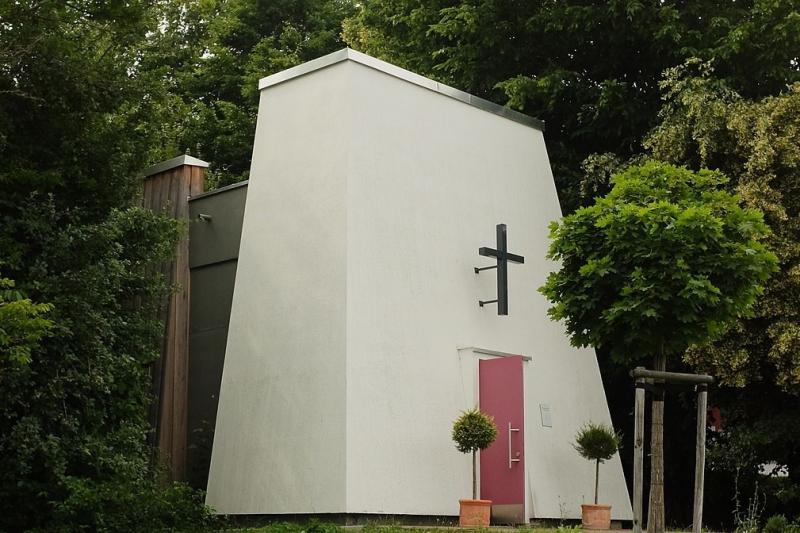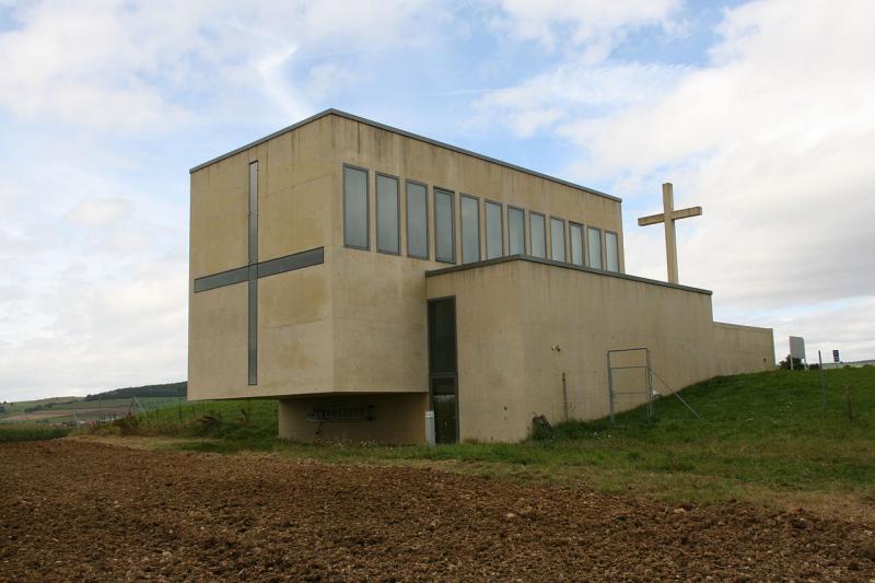 The Motorway Chapel of Hegau (officially Emmauskapelle) is located in the service area of Hegau West near Engen on the Federal Highway 81 from Stuttgart to the south. Instead of the original, too expensive dome model by the Hungarian architect Imre Makovecz, the project by the Ravensburg architect Wolf R. Bürhaus was selected in an architectural competition. The complex consists of a high cross, an inner courtyard and a parallelepiped-shaped chapel. Access to the chapel is via a narrow inner passage.