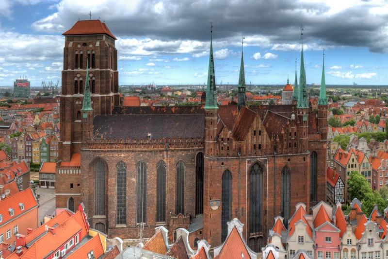 St. Mary's Basilica served as a Catholic and Protestant church (between 1572 and 1945). Built from 1346 to 1361, the church is an example of brick Gothic (typical of the Baltic basin) and is one of the largest brick churches in the world. During the liberation battles of Gdańsk in March 1945, the wooden roof, vaults and bells of the church were heavily damaged. After being restored, the church was rebuilt in 1955.