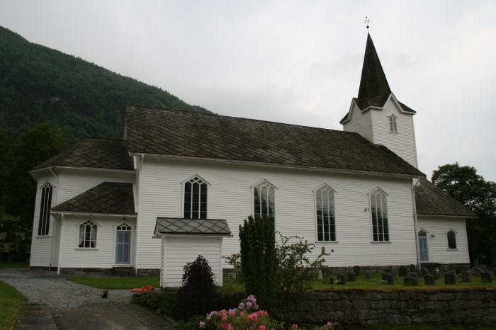 The church of Jondal, which was consecrated in 1888, is a typical long church with an entrance and a tower to the west. The church is characterised by a simple Swiss neo-Gothic style with gabled windows. In 1976, an extension was built around the base of the tower.