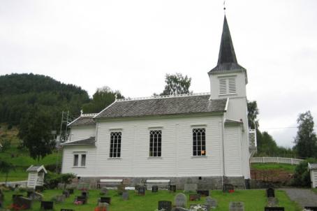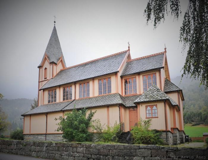 Kyrkjebø church is a long church dating from 1869, designed by the architect Christian Christie, who was inspired by the stave churches.