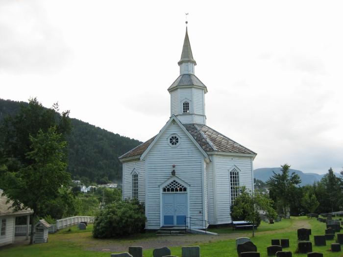 The Lavik church is an octagonal church built in 1865 according to the plans of the architect Christian Heinrich Grosch and is made of wood. Today's church is the third known church in the town. The first was a stave church which probably dates from the 12th century. The stave church was replaced by a new church in 1594, which in turn was replaced by the present church from 1860 onwards.