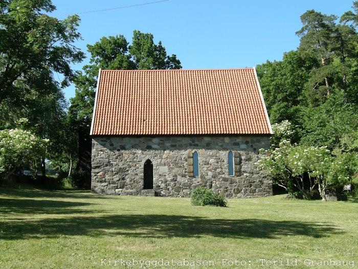 The "new church" in stone dating from the Middle Ages. It is a long church with a rectangular nave and a lower, narrower choir. In 1848 the church was given a tower at the west end of the nave, and in 1880 a vestry was built at the east end of the chancel. The church belonged to the county of Jarlsberg from 1673 to 1776, when 25 men from the congregation bought the church. It was not until 1877 that the church became the property of the congregation.