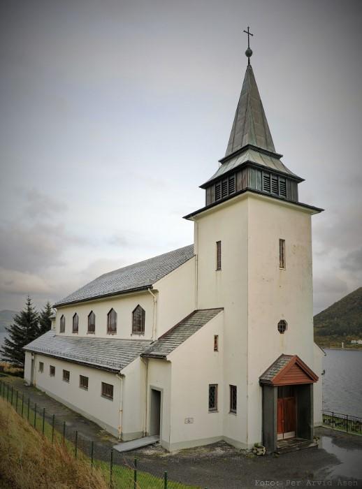 The church in Nord-Vågsøy, in its present form, replaces a church that burned down in 1945. It is a long concrete church that was consecrated on 24 October 1960 by Bishop Ragnvald Indrebø.