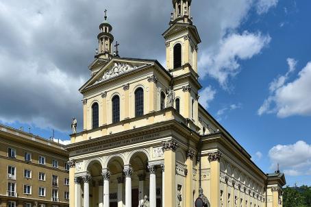The Church of St. Karol Boromeusz was built in 1841-49 in the neo-Renaissance style according to the design of Henryk Marconi. It was modelled on the Roman basilica of Santa Maria Maggiore, the basilica of St. Paul behind the walls and the interior on the church of Notre-Dame-de-Lorette in Paris. The façade is flanked by two towers and preceded by a three-bay vestibule. On the façade are statues of the apostles Peter and Paul. The façade is crowned by a pediment with a tympanum depicting the patron saint of the church, Carlo Borromi, administering the sacrament of Holy Communion to the inhabitants of Milan during the plague epidemic of 1567.