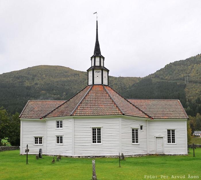 The Stordal church is a wooden church built in 1907. The stained glass windows in the church were made by Veslemøy Nystedt Stoltenberg.