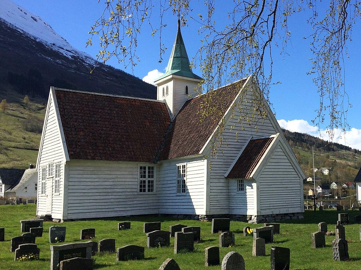The Olden Old Church is a wooden church built in 1759 on the site of an old stave church probably dating from the 14th century. The stave church was demolished in 1746 and replaced by a wooden church which was destroyed by a storm in 1757. As it has no heating or electric light, a new service church was built in Olden in 1934.