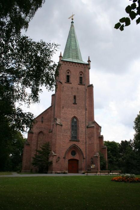 The Østre Aker church is a neo-gothic building from 1860. The interior of the church is also characterized by neo-gothic elements with cross-vaulted ceilings and eight monolithic columns, carved from whole pieces of granite. The rose window above the altar was donated to the church during the restoration in 1927-35.