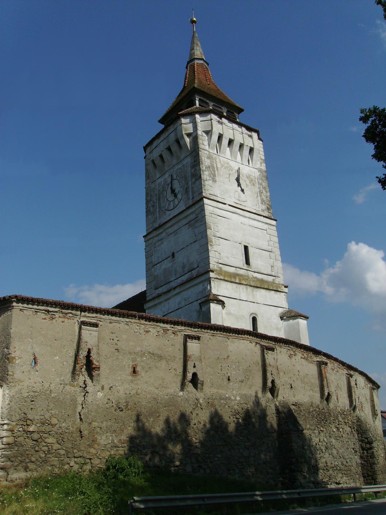 The small Romanesque hall church erected in the 13th Century with square chancel, apse and western tower was fortified in the 15th Century. The walls of the tower were strengthened and a parapet walk was built and it was provided two centuries later with a mighty machicolation. Even the curtain wall with loopholes and machicoulis was built in the first fortification phase. No remains have been preserved from its gate tower and the parish house later replaced the eastern side. The roof of the tower is inspired from the bell tower of the Black Church in Brasov and was built after a fire in 1738.