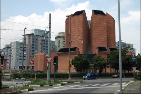 Santo Volto was built between 2004 and 2006 on a design by Mario Botta. The building draws its inspiration from the industrial district in which it is located, an ancient chimney was even intentionally left beside the church.