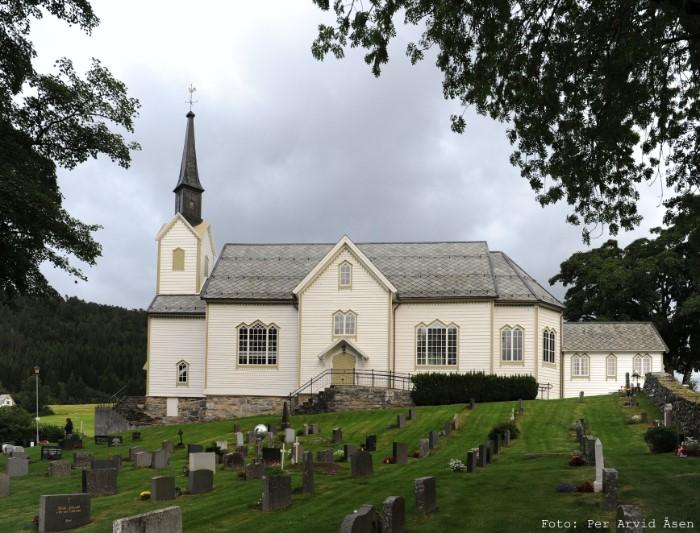Skodje church dates from 1860 and is built of wood. The architect was F. Meinhardt and the builders were Gjert Lien and Elias Tonning from Nordfjord. The altarpiece on the altar in the church dates from 1883 and is a copy by Adolph Tidemand.