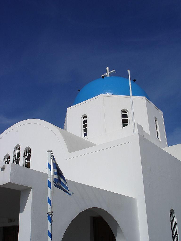 The 19th-century church of Agios Gerasimos blends perfectly with the Cycladic architectural style of Santorini. Perched on the rocky hillside of the island, it delights visitors with a breathtaking view of the caldera and an endless blue sea. It is no surprise that this church is one of the most desired places for photographers. The main entrance consists of a portico with three whitewashed arches. But the most outstanding feature of this church is the bell tower, also crowned by the typical blue dome.