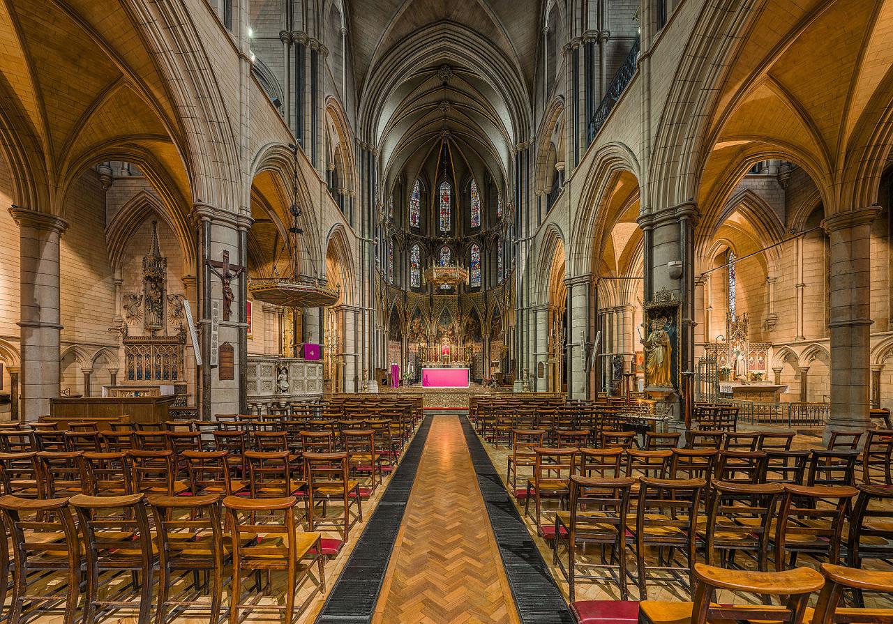The successor church to the Spanish Embassy chapel by Bonomi was built by his great grandson, Edward Goldie, following a limited competition. Early English Gothic was the prescribed style but the design also drew on French Gothic models. The church was extended westwards during the First World War. Bentley provided furnishings for five chapels and shrines. Situated on a tight site, its height and detailing make the church a local landmark, despite lacking its projected tower and spire.
