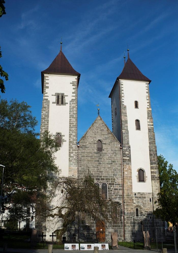 St. Mary's Church in Bergen is a long church in the form of a basilica. Inside, strong square pillars support the vaults and mark the transition between the nave and the aisles. The choir is lower and narrower than the nave. The church has two towers that rise above the western end of the aisles. The church was built in the classical Romanesque style in the first half of the 12th century, but there are also later additions in the Gothic style. The magnificent altarpiece was probably made in Lübeck in the late 15th century.