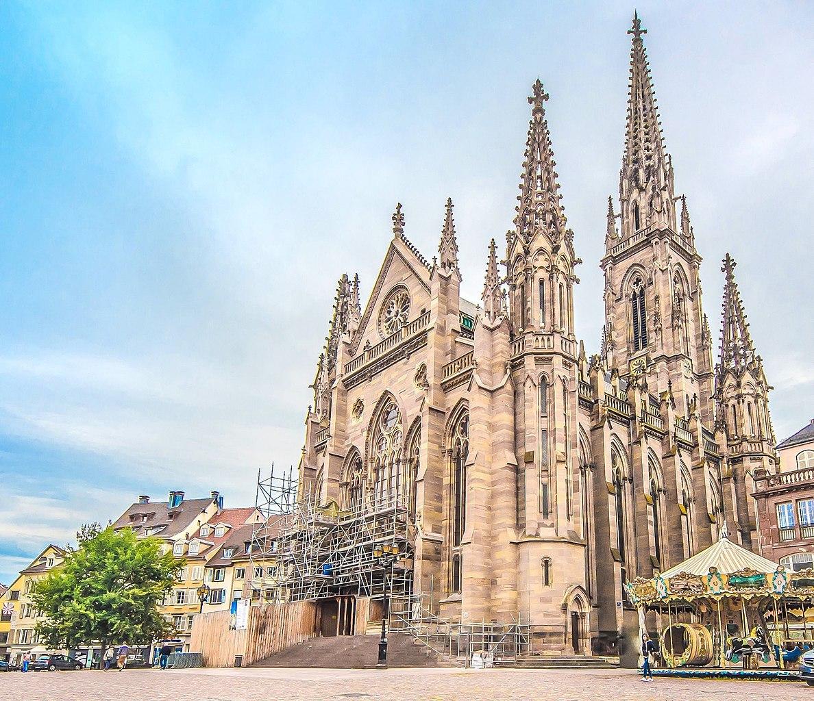 The Saint-Etienne temple is the main reformed church in the city of Mulhouse. Its dimensions make it the tallest Protestant building in France and it is often referred to as the "cathedral" of Mulhouse. The present building dates mainly from a construction phase from 1859 to 1866, but a Romanesque building was dedicated here as early as 1186. In 1523, persecuted by the Protestants of the region, the Catholics were expelled from St. Stephen's Church to make room for the Reformed cult. The tower was given a baroque bulb in 1707. The church was destroyed in 1858.