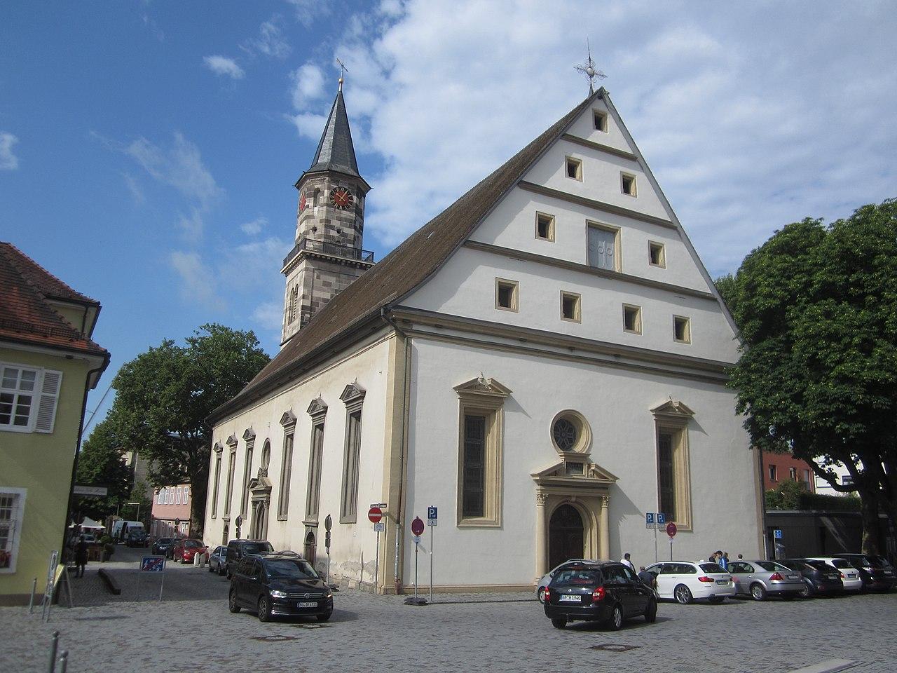 The town church of Göppingen is one of the largest Protestant churches of the Renaissance. On the present site of the town church there were probably several earlier buildings, the most recent of which is St. John's Chapel, first mentioned in 1348. After the introduction of the Reformation in Göppingen in 1534, the chapel, which was rebuilt in Gothic style after the town fire in 1425, became the town church. Between 1838 and 1845, the dilapidated tower in the south-western corner of the church, which still dates from the time of the town fortifications and St. John's Chapel, was removed and the present tower was built in the centre of the south gable.