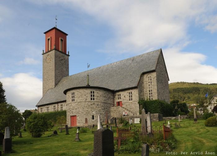 The Volda church is a stone church consecrated in 1932. In the 1400s there was a stave church here. It was demolished in 1858 and replaced by a new wooden church in the shape of a cross, one of the largest wooden churches in the country. It burned down the night before April 7, 1929. None of the partly very old furniture was saved. The present church has a choir with a fresco by Hugo Mohr. This fresco, which was at the time the largest fresco work in Norway, was completed in 1932.