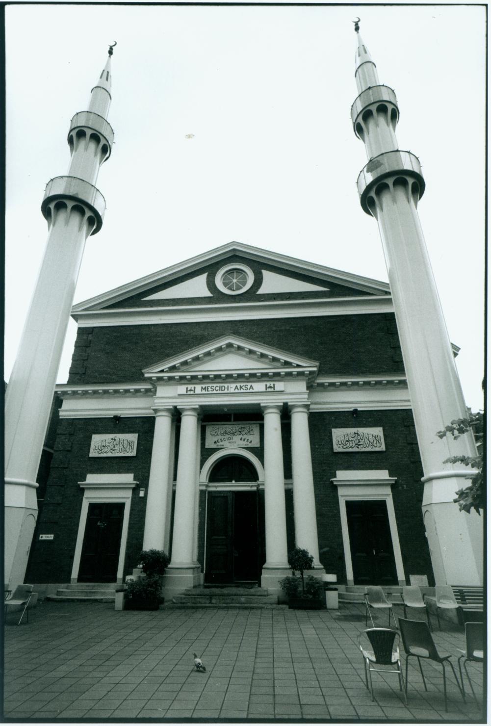The synagogue is located behind the private residences of the Wagenstraat. It was consecrated in the year 1844. It replaced an older synagogue which was situated at the Voldersgracht (dated ca. 1721/23). The Neo-Classical main façade includes a cornice and triangular pediment with a tondo window. The entrance itself is also adorned with a triangular pediment is supported by Tuscan columns. Rounded arched windows can be found in the side walls of the building. The entrance originally contained an unknown Hebrew inscription and the date 5604 (1844 CE) but these were removed in the year 1981. The synagogue was oriented along the short axis which meant that the Torah ark was situated against the long southeastern wall. The bimah was placed at the center of the assembly hall, facing the Torah ark. The building, including the galleries which are supported by slender Ionic columns, were expanded in 1922. The complex was expanded with the establishment of an administrative building and a second synagogue along the Nieuwe Molstraat (demolished in 1981), designed by the architect H. Elte Phzn in the architectural style of the Amsterdam School. The interior of the synagogue was damaged by fire during the Second World War in 1944. Three years later, the building was again consecrated as a synagogue after which the Jewish religious services resumed. In 1976, the building became abandoned and was subsequently sold to the municipality of The Hague. The decorated Torah ark (ca. 1723) was removed and relocated to Israel in the same year. The building was repurposed as a mosque which opened its doors in the year 1979. The front façade of the building received Arabic inscriptions and two large steel minarets were placed in the forecourt of the building.