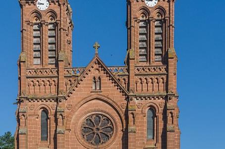 The building has imposing dimensions: nave 102m long and elevation 30m high. The bell tower is in pink sandstone lace and rises to more than 87 m. It is the flattest bell tower in France.