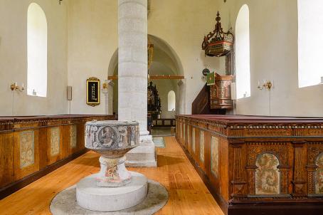 The interior of the church preserves a baptismal font from the 12th century by sculptor Byzantios, a rood cross from the 12th century (which is one of the oldest triumphal crosses on Gotland), and altarpiece and pulpit from the 17th century, and the choir stalls, which were also made in the 17th century, but incorporating medieval elements to match the style of the church's interior.