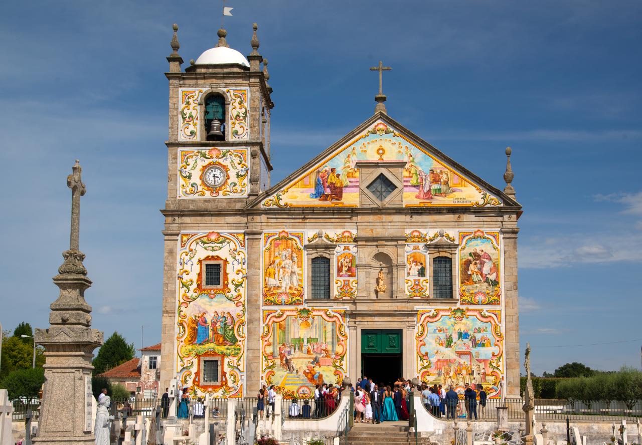 The Parish Church of Válega is a Baroque style church with the characteristic Portuguese mosaic of tiles creating religious scenes in the front, even though tiles usually depict blue plant designs.